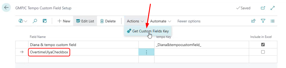 Enter the exact field name in the Field Name and click Actions > Get Custom Fields Key. The field key will appear as Tempo Key.