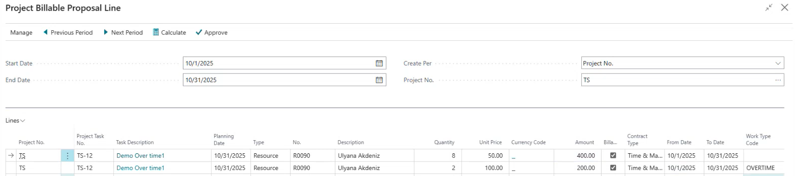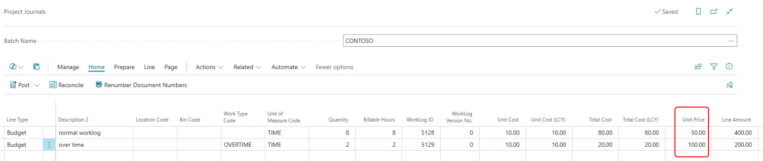 After the tasks with overtime worklogs are imported and processed, go to Project Journals to verify that the Unit Prices for normal and overtime hours are correct (use standard BC functionality to configure Unit Prices).